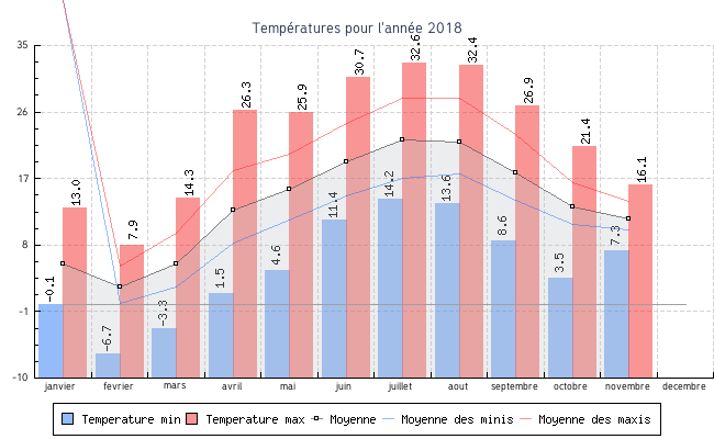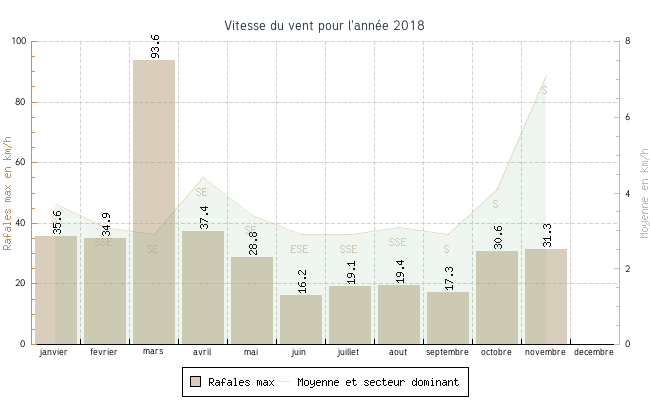 | fevrier | -6.7 °C | 0.1 °C | 7.9 °C | 5.2 °C | 2.4 °C | 3.1 km/h | 34.9 km/h | SSE |