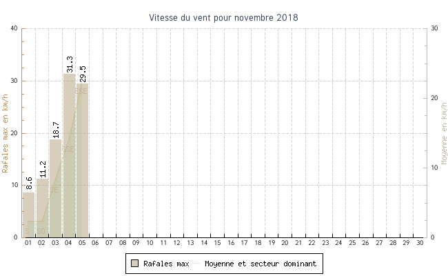 | min | max | moy | Vitesse (rafales) | Secteur | ||